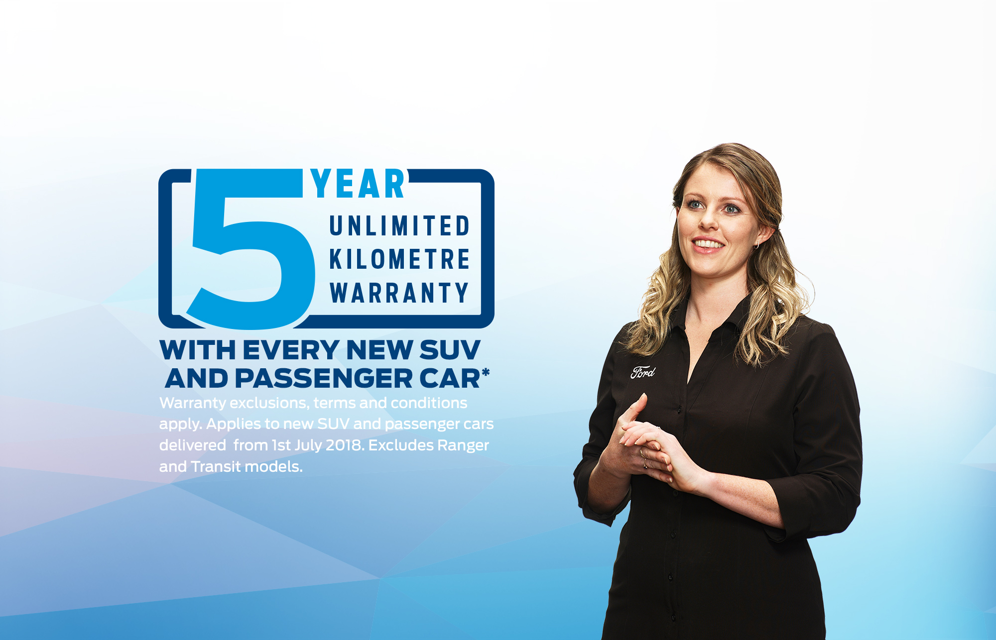 - New Five year warranty applies to all new Passenger, SUV and Transit vehicles delivered from July 1, 2018 and the new 2019 Ford Ranger with expected arrival in October 2018